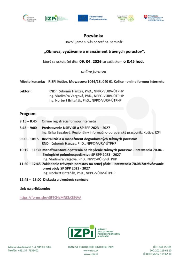 Pozývame vás na odborný seminár: Katalóg poľnohospodárskych strojov, stavieb a techniky – tvorba a aplikácia Kedy: 28. apríla 2026 o 10:00 hod.Kde: NPPC – Lužianky – kongresová sála Zaregistrujte sa cez formulár: https://tinyurl.com/46npazu5