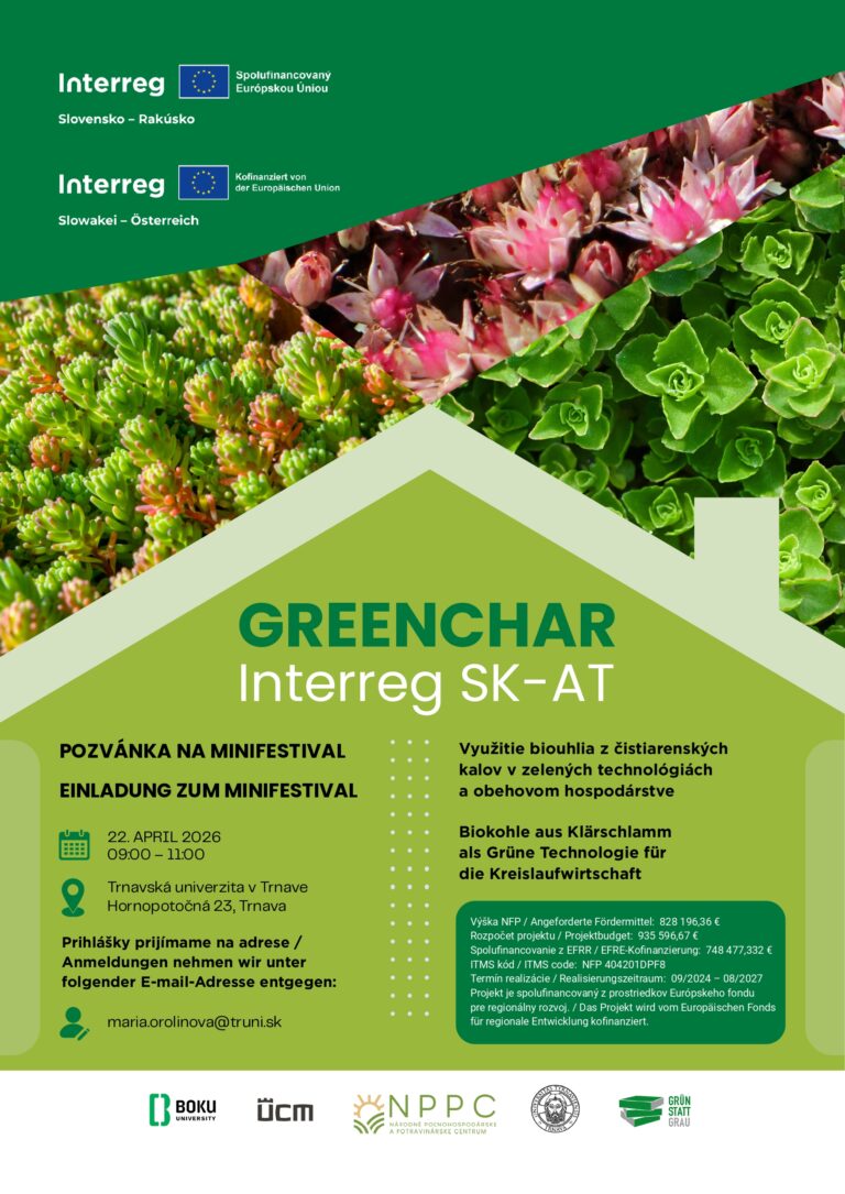 Pozývame vás na minifestival GREENCHAR zameraný na využitie biouhlia a riešenia pre udržateľnú budúcnosť. 📆 22. 4. 2026 | 📍 Trnava Podujatie ponúkne zaujímavé diskusie